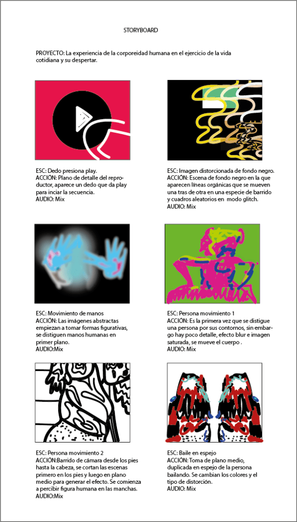 El cuerpo es el principal protagonista, desde el video proyectado hasta el cuerpo tangible de las personas que visiten la experiencia, su mismo cuerpo bloqueará la luz del proyector para proyectar la sombra de su cuerpo entero, permitiéndoles de esta forma interactuar con el resto de las imágenes danzantes del video proyectado.