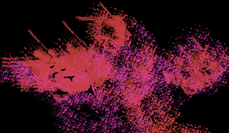 Exploración 1 – Variable 1 (23/04/22): Según la temática corpórea se hacer aparecer el cuerpo por en medio de la distorsión causada por las texturas de algunos pinceles de Photoshop que al mismo tiempo le da movimiento la composición, se trata de una persona con las manos al frente. Se juega con las tonalidades brillantes roja y rosada para un efecto de intensidad en la pantalla.